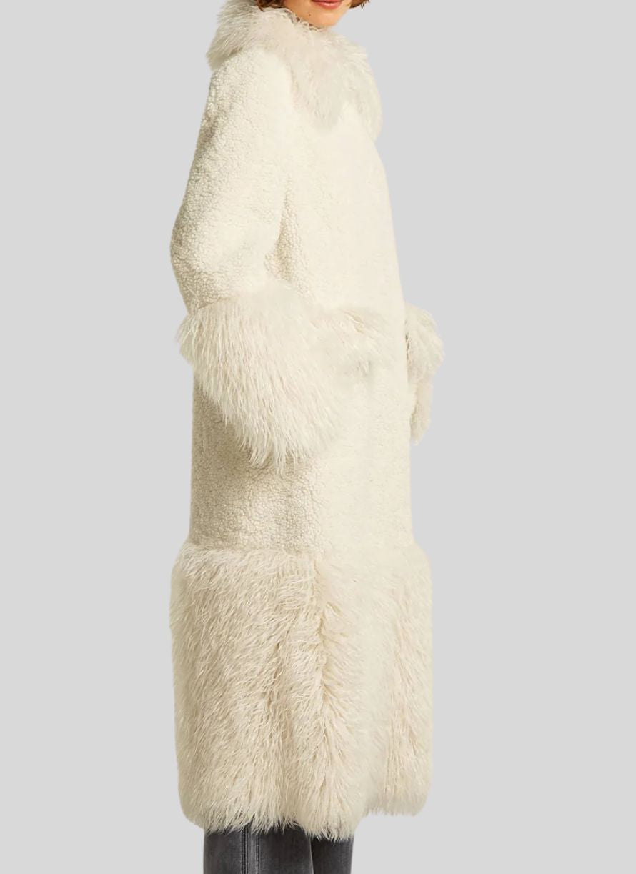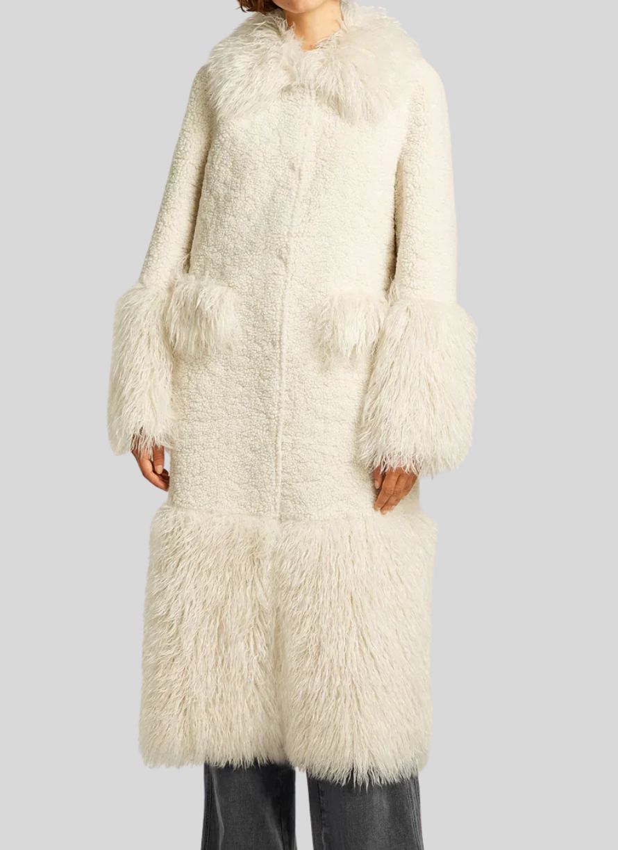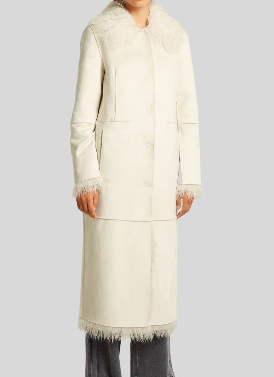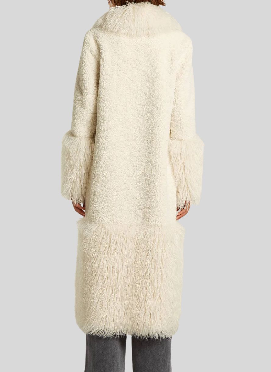 Abrigo largo reversible confeccionado en una mezcla de falso pelo reciclado y suede sintético. Gracias a su diseño versátil, se puede llevar por ambos lados, adaptándose a diferentes estilos. Cuenta con cierre de botones de presión ocultos y bolsillos con abertura en las costuras, ideales para mayor comodidad. Su largo en la espalda central es de 120 cm, proporcionando una cobertura elegante y funcional. Perfecto para un look sofisticado y sostenible.