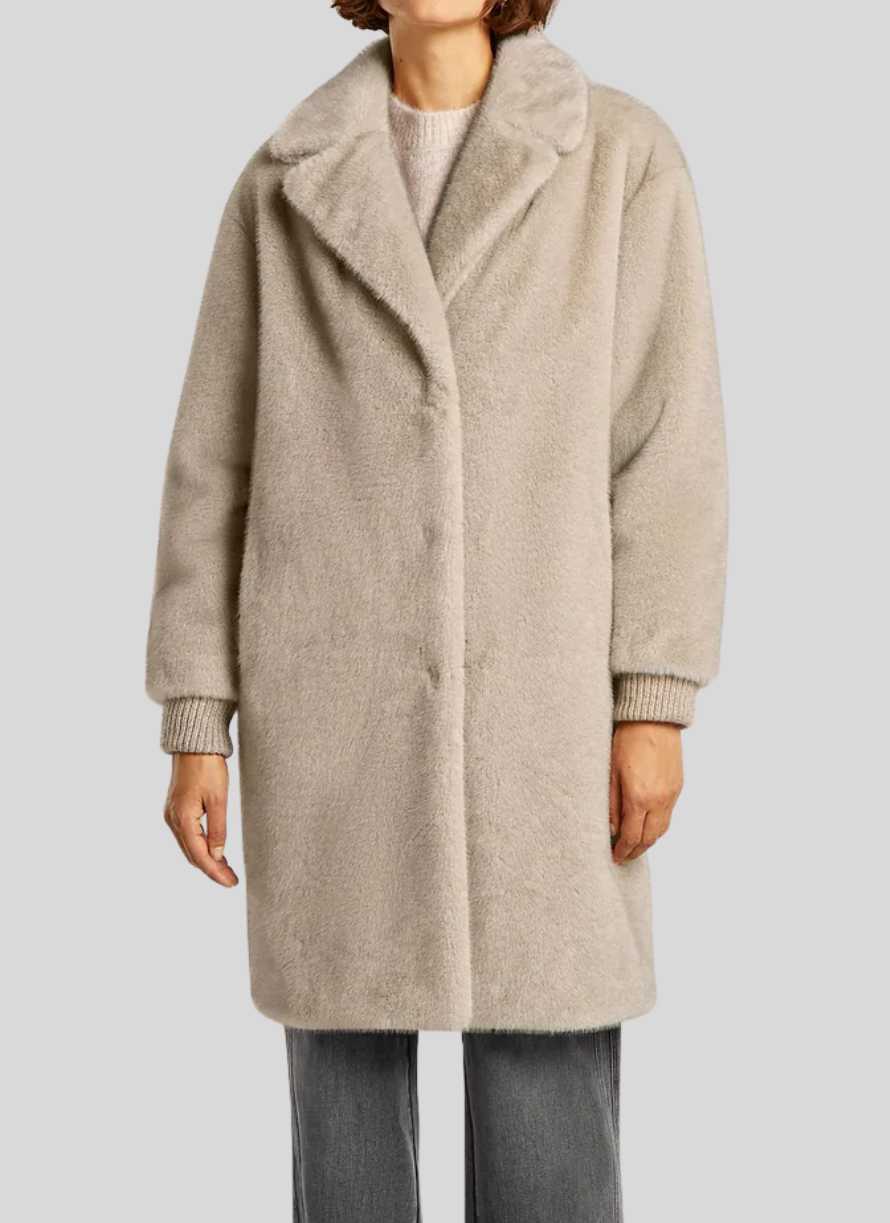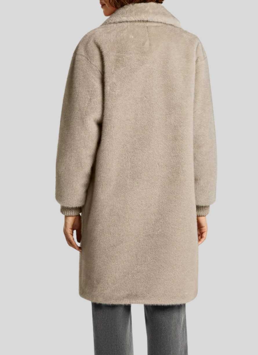 Abrigo largo confeccionado en lujoso pelo sintético mélange que aporta textura y calidez. Está completamente forrado e incluye un bolsillo interior para mayor funcionalidad. Cuenta con cierre frontal de botones a presión y puños de canalé para un ajuste cómodo y estilizado. Su largo central en la espalda es de 97 cm, ideal para protegerte del frío con elegancia.