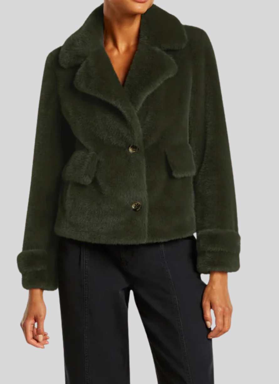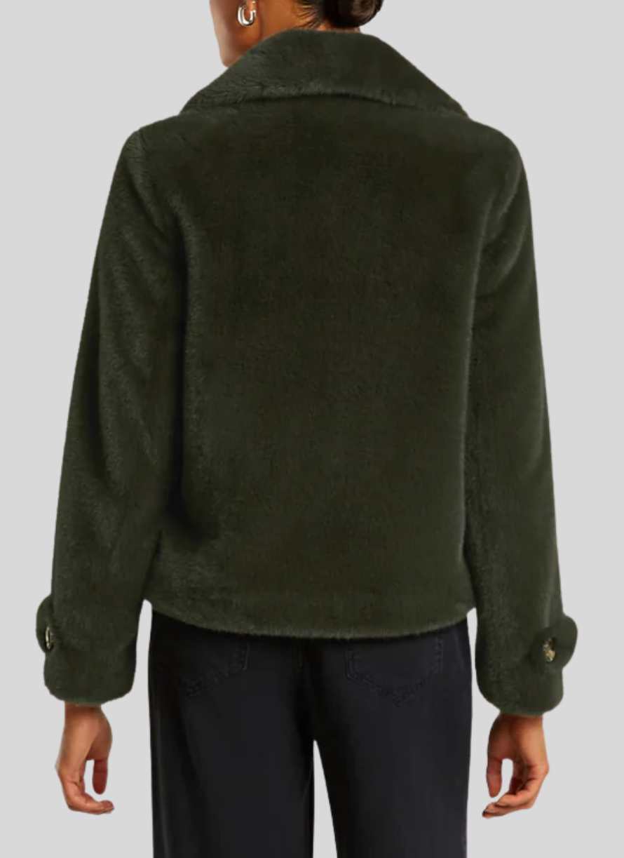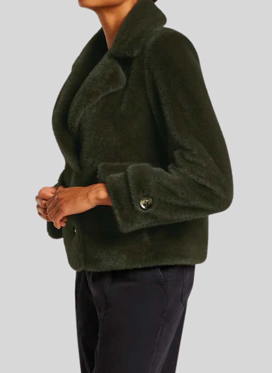 Abrigo tipo blazer corto elaborado en lujoso pelo sintético reciclado que combina elegancia y sostenibilidad. Totalmente forrado e incluye un bolsillo interior para mayor practicidad. Presenta cierre frontal con botones y bolsillos de abertura en el panel frontal. Su largo central en la espalda es de 58 cm, ideal para un toque sofisticado y moderno en tu look.