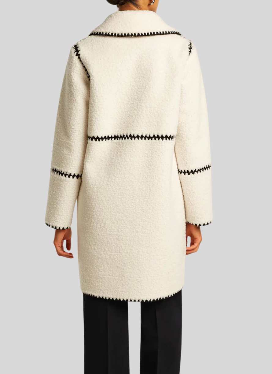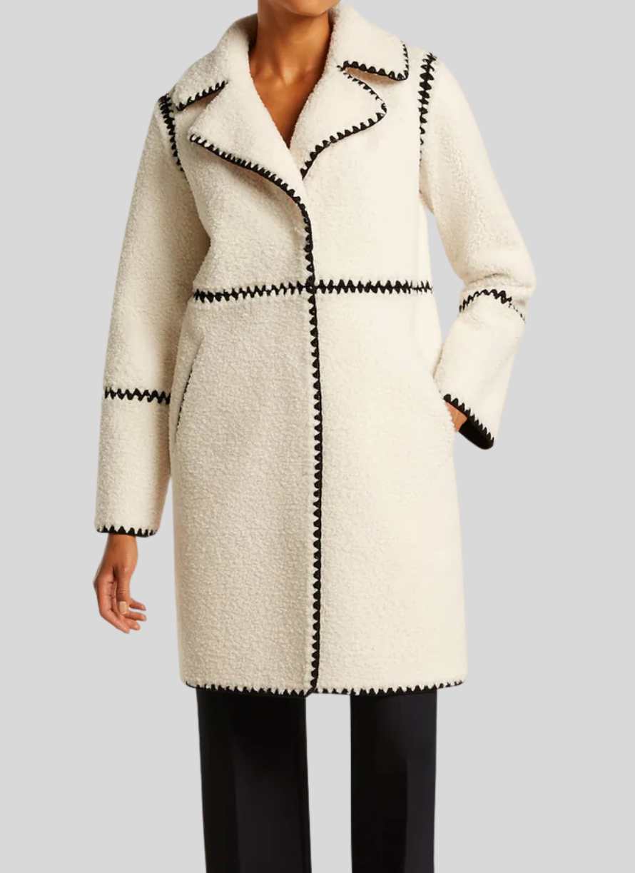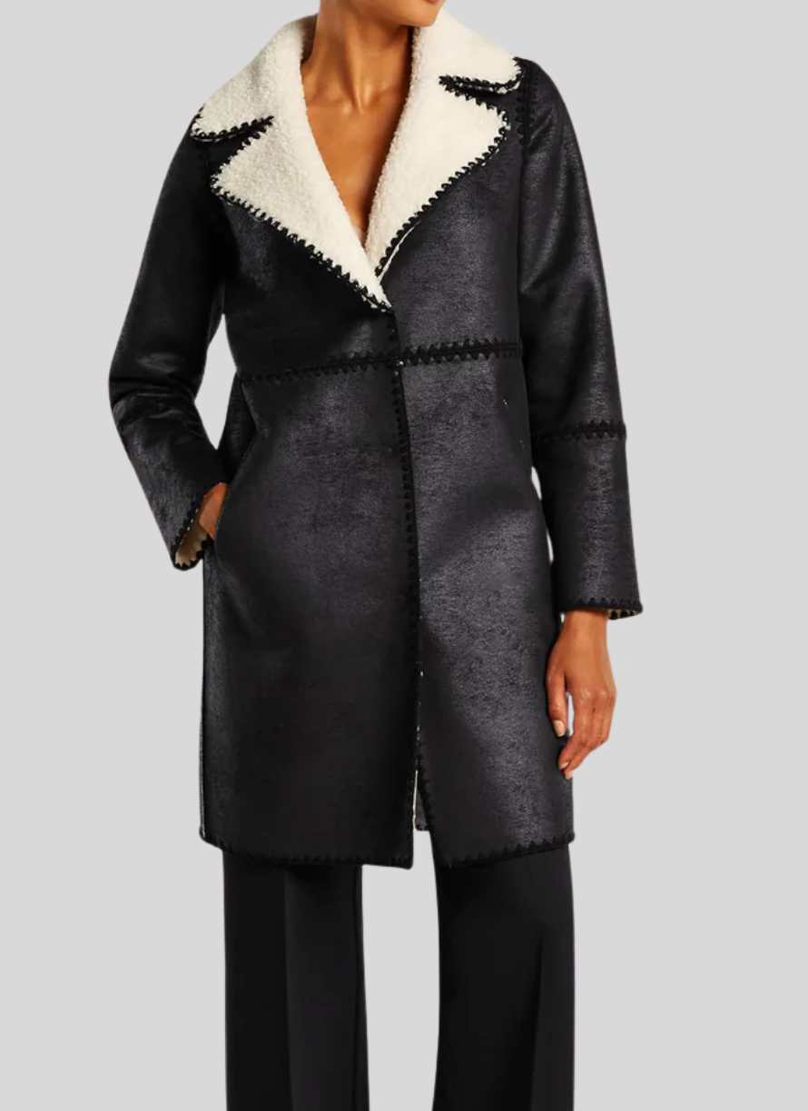 Este abrigo reversible Beaument combina suavidad y estilo con su tejido tipo teddy y detalles bordados en contraste negro. Forrado con ante negro, ofrece versatilidad para usarlo por ambos lados. Cuenta con bolsillos tipo ojal en la parte delantera y cierre frontal con botones de presión ocultos. Su largo en la espalda central es de 95 cm, ideal para un look cómodo y sofisticado en cualquier ocasión.