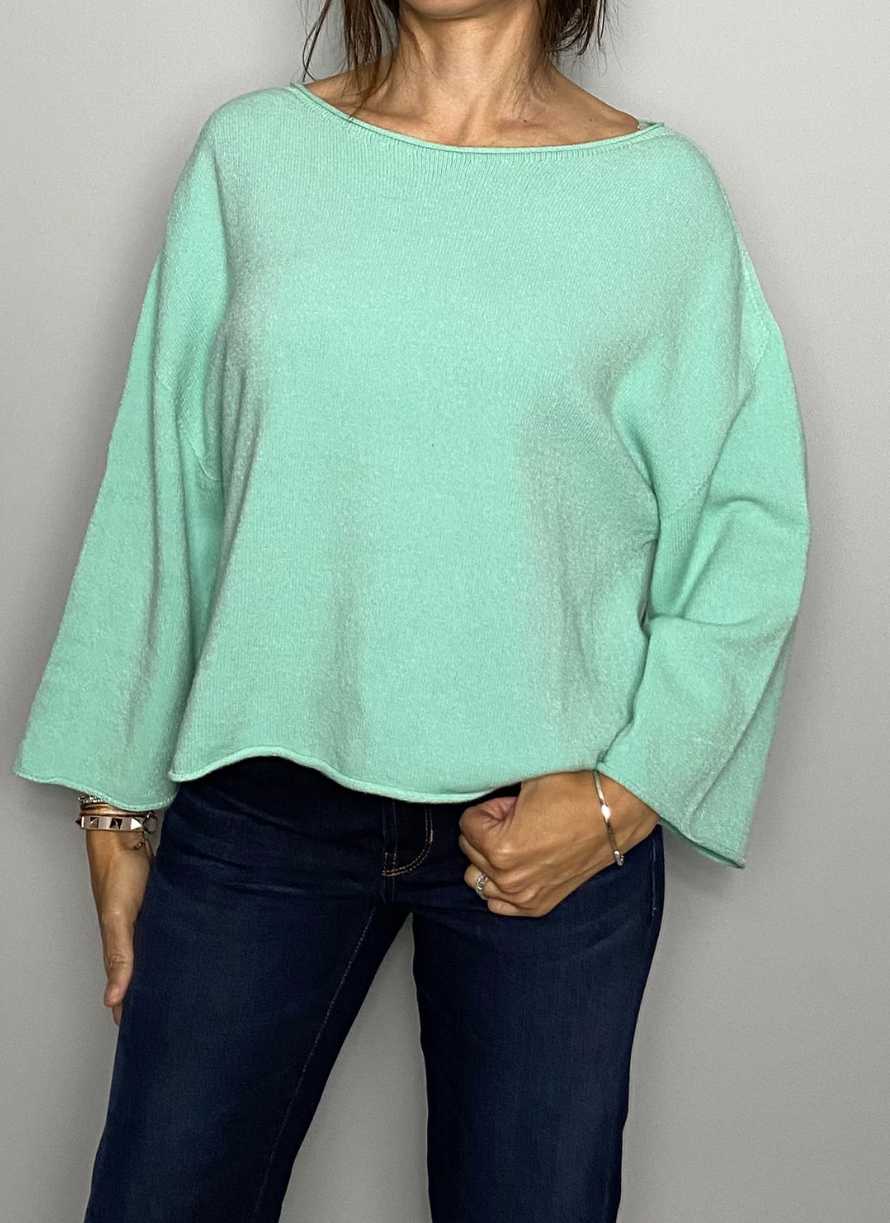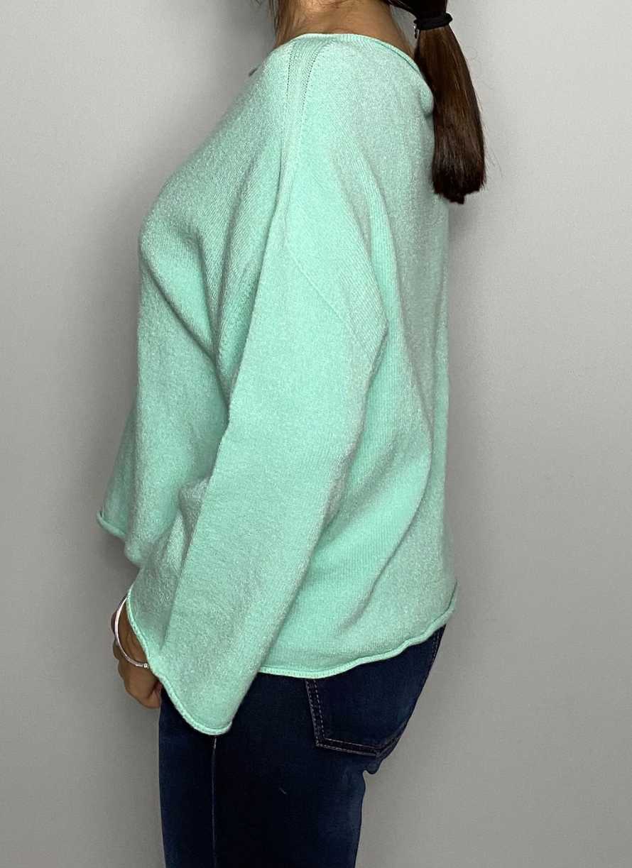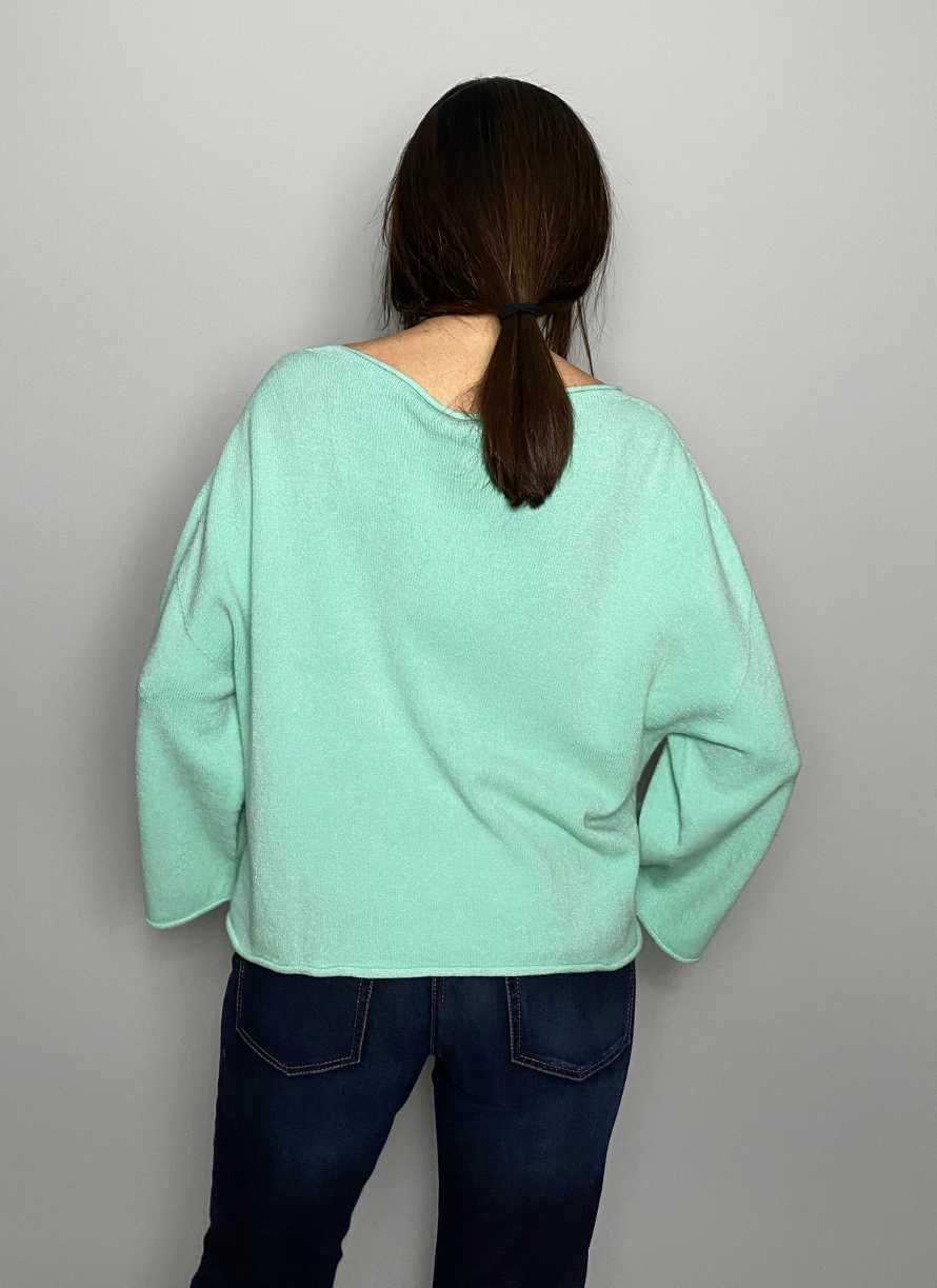 Jersey de cuello redondo en un refrescante color menta, con mangas ligeramente acampanadas que aportan un toque delicado y moderno. Su diseño combina comodidad y estilo, perfecto para looks frescos y elegantes.