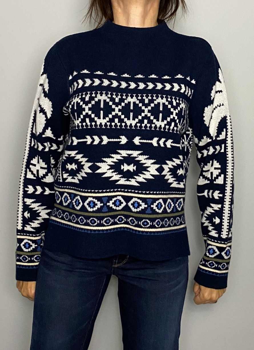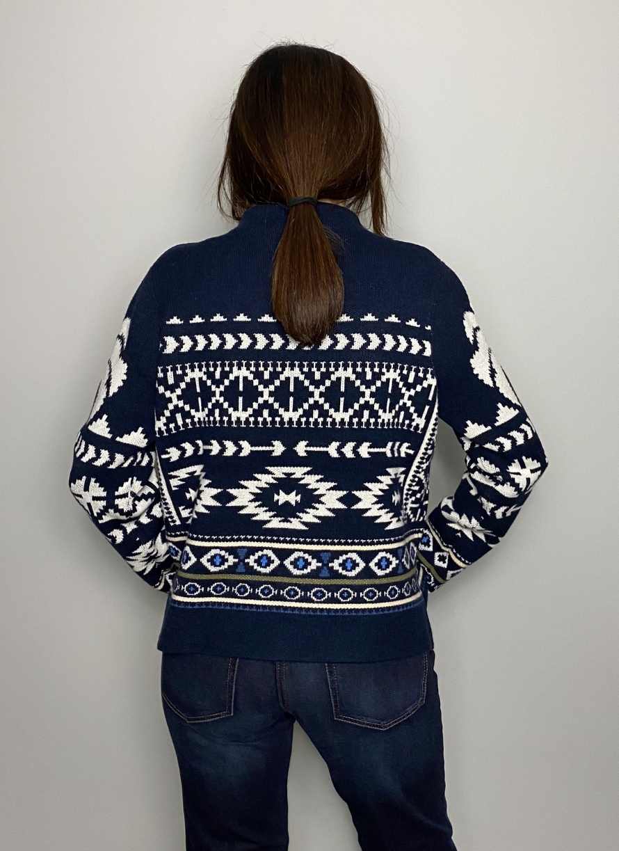Este jersey de cuello redondo combina estampados en tonos azules y blancos para un estilo fresco y versátil. Su corte recto ofrece un ajuste cómodo que se adapta a diferentes estilos, perfecto para looks casuales o formales. Ideal para aportar un toque de color y elegancia sencilla a cualquier conjunto.