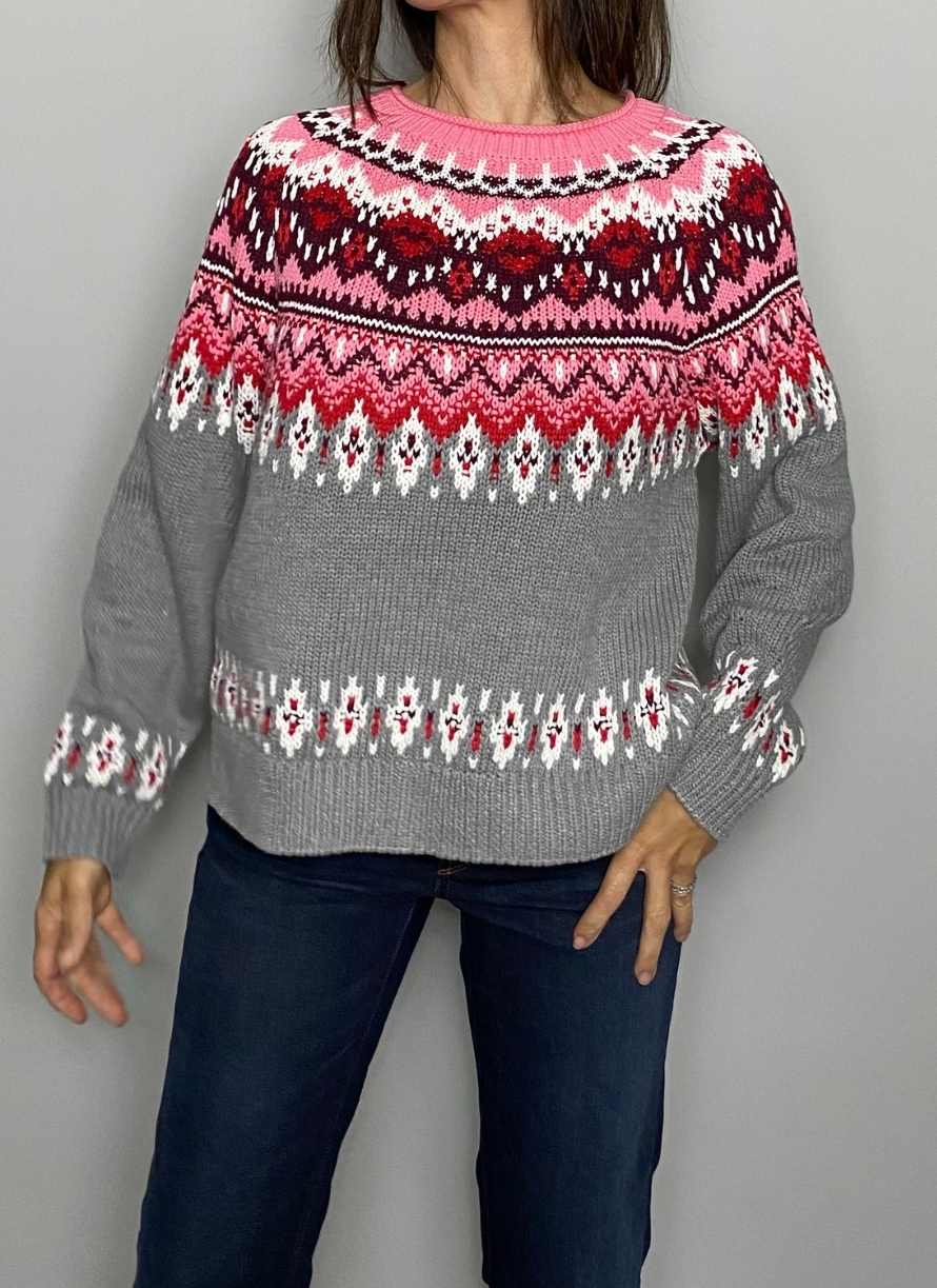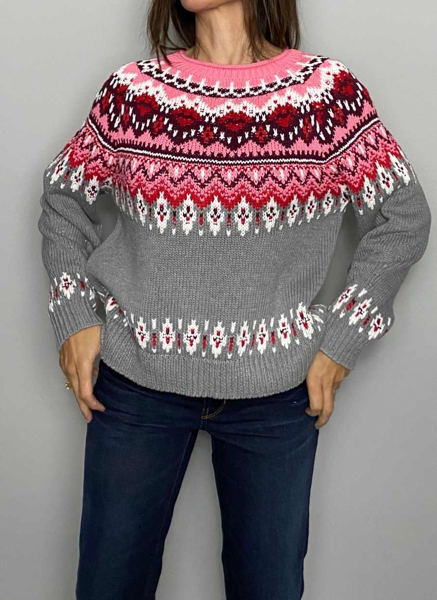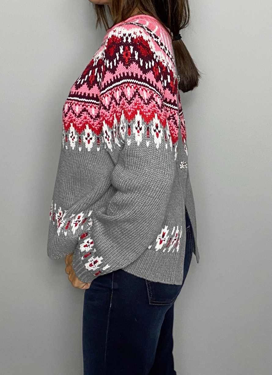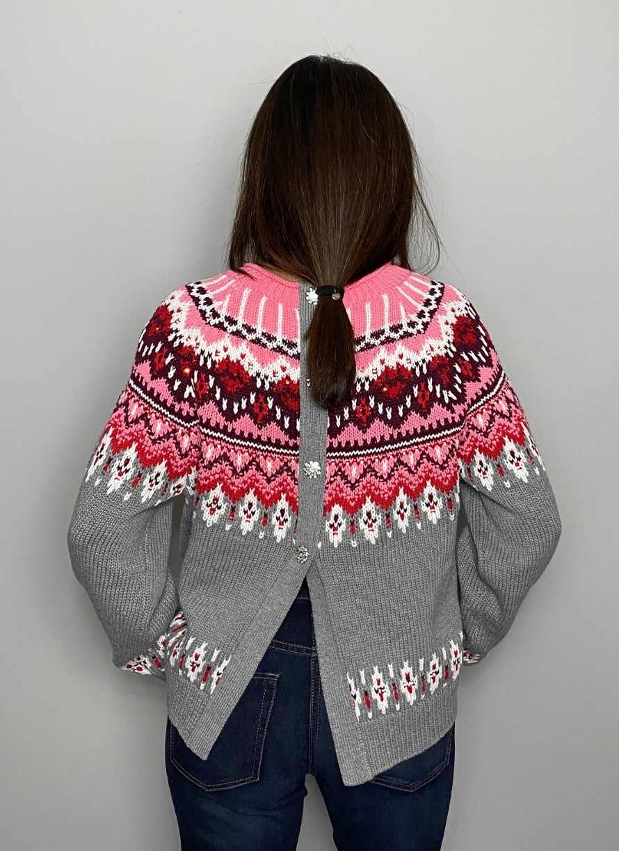 Este jersey de algodón multicolor presenta un cuello redondo y un corte recto que aporta comodidad y estilo relajado. La abertura en la espalda, decorada con botones de efecto brillante, añade un detalle sofisticado y original, perfecto para destacar con un toque moderno en cualquier ocasión.