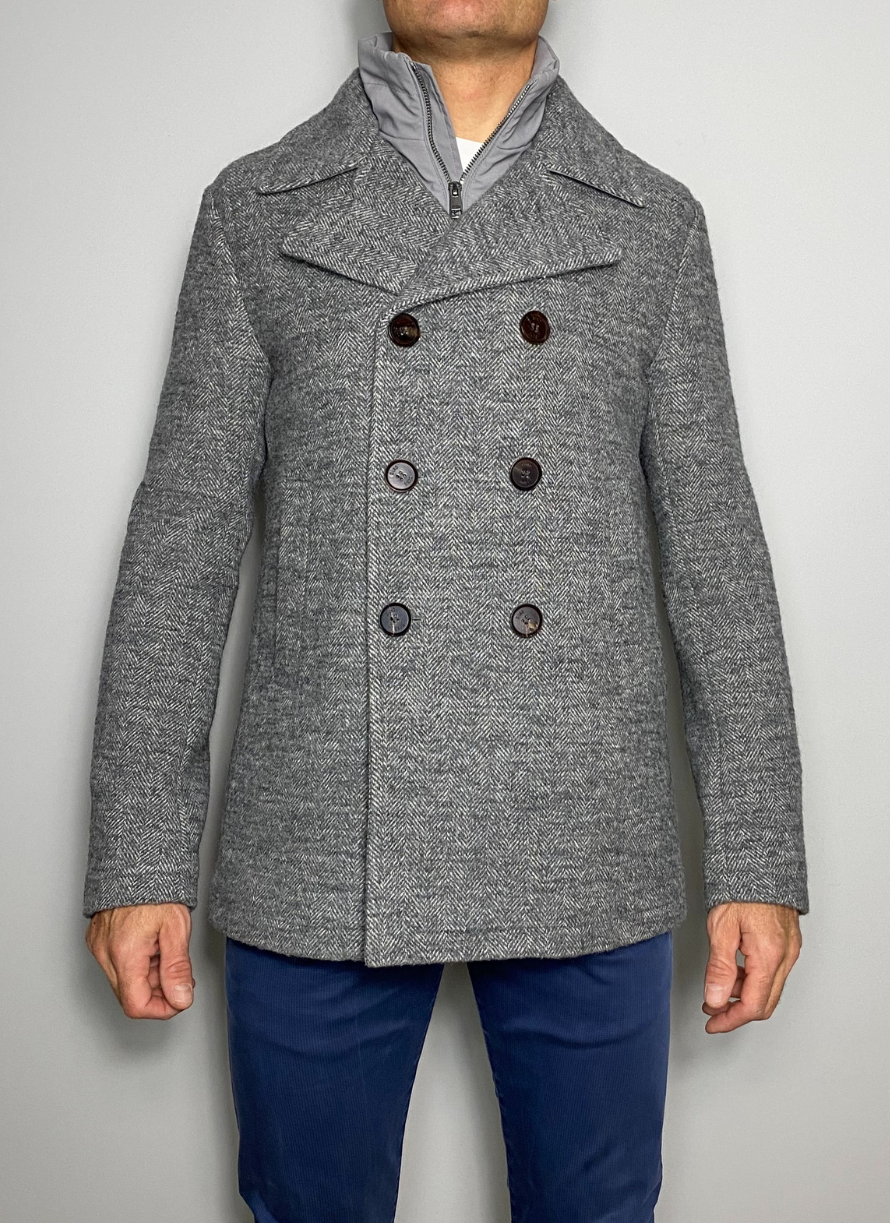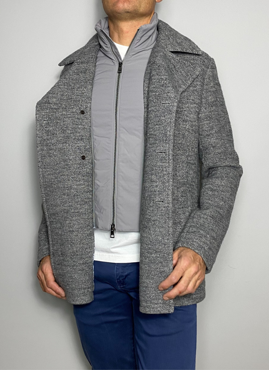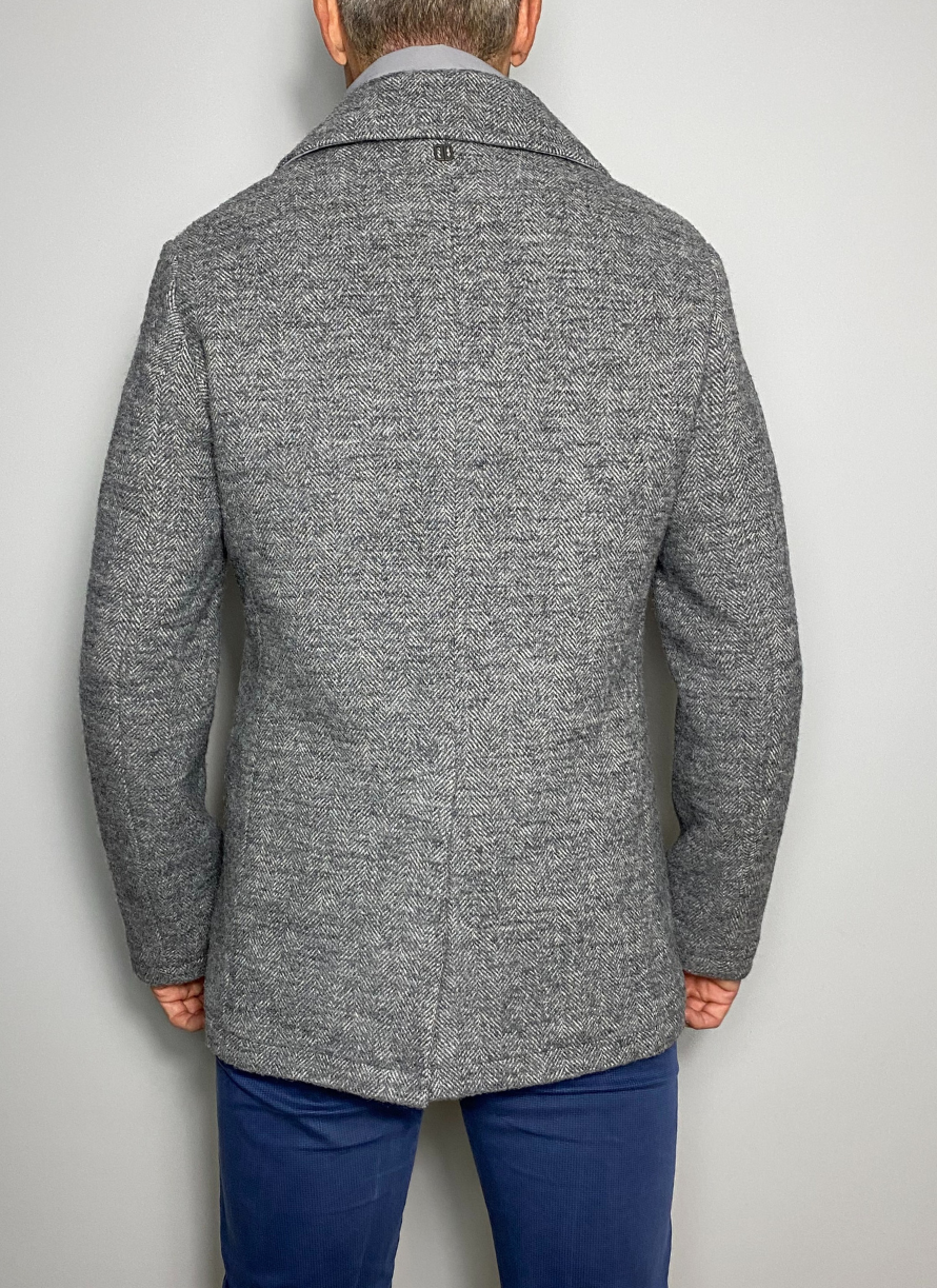 Este abrigo que combina tradición y funcionalidad con su tejido de lana en patrón espiguilla grande. Cuenta con un efecto chaleco desmontable ligeramente acolchado en tejido técnico, cierre de cremallera y cuello alto para mayor protección. Su cierre frontal de botones y el bajo cuello con pespuntes en zigzag aportan estilo y detalle. Dispone de bolsillos de ojal con cierre de botón a presión, un amplio bolsillo interior multifuncional y una abertura central trasera que facilita el movimiento. Perfecto para mantener el calor con un toque elegante y práctico.