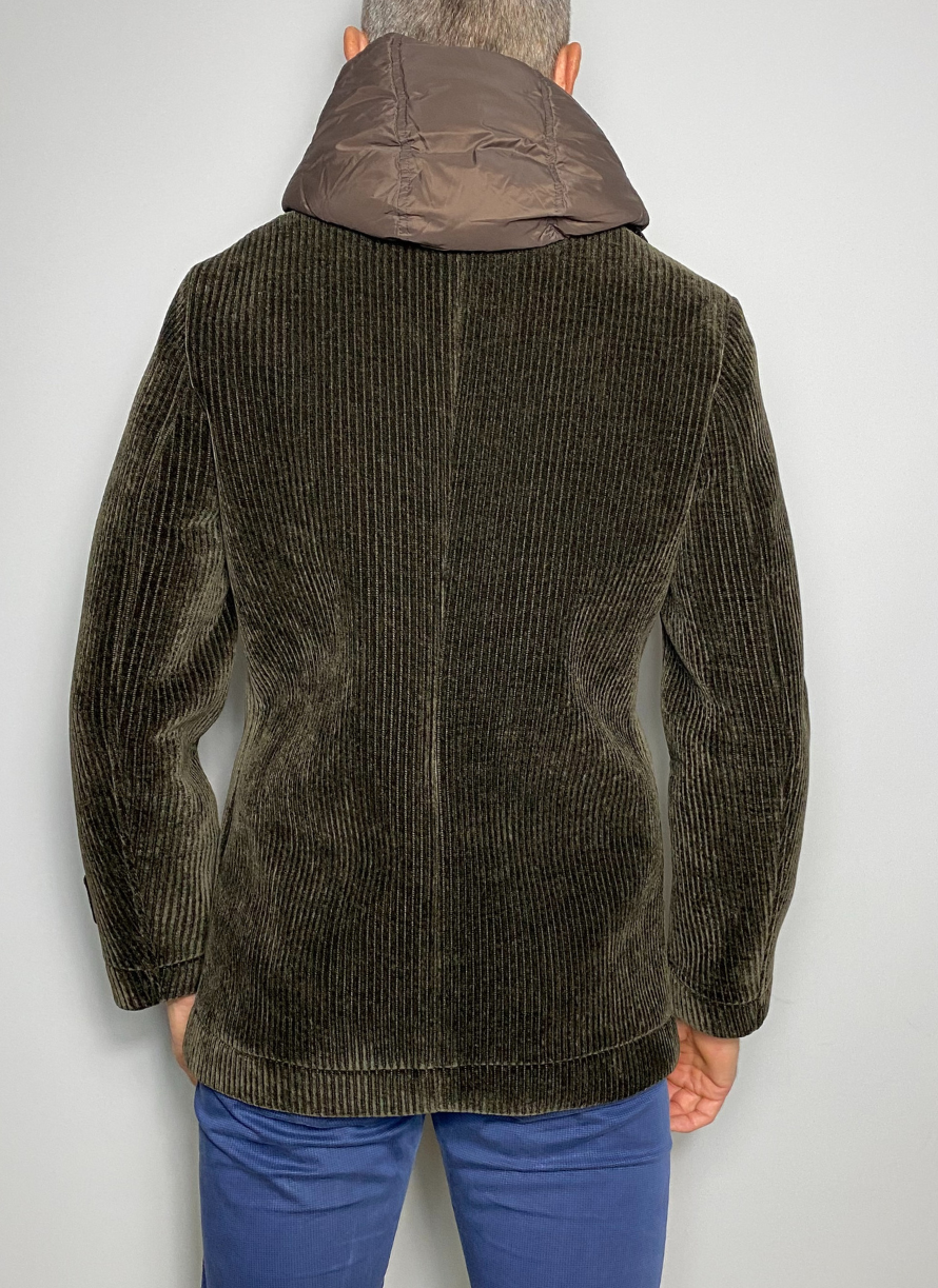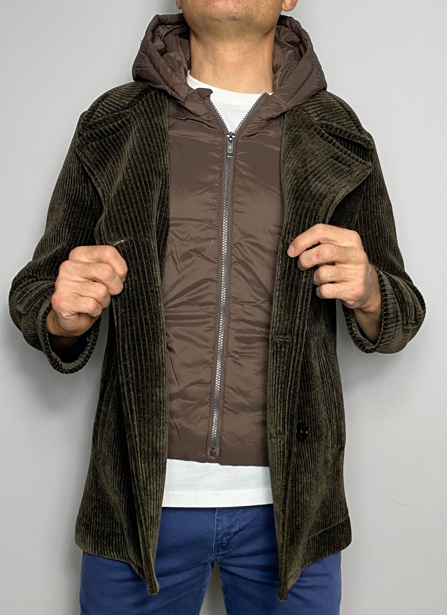 Este abrigo Distretto, confeccionado en neopreno cómodo, combina estilo y funcionalidad. Presenta un diseño cruzado con cierre de botones y buttonholes, dos bolsillos de ojal y un interior sin forro con bordes en contraste y un bolsillo interior de punto con costura Milano. Incluye dos tirantes elásticos desmontables con logo y una pechera acolchada de nailon con capucha también desmontable, ideal para adaptarse a diferentes condiciones climáticas y mantener un look versátil y práctico.