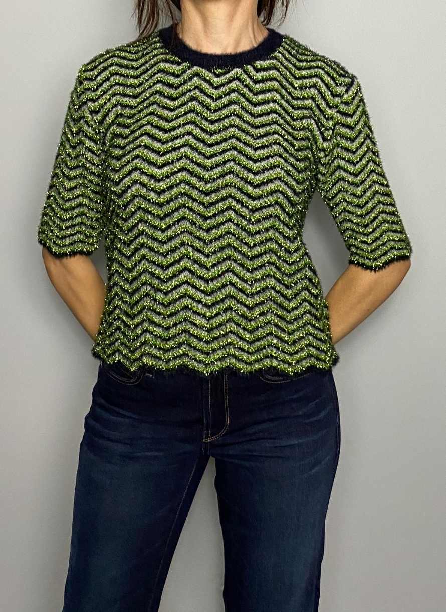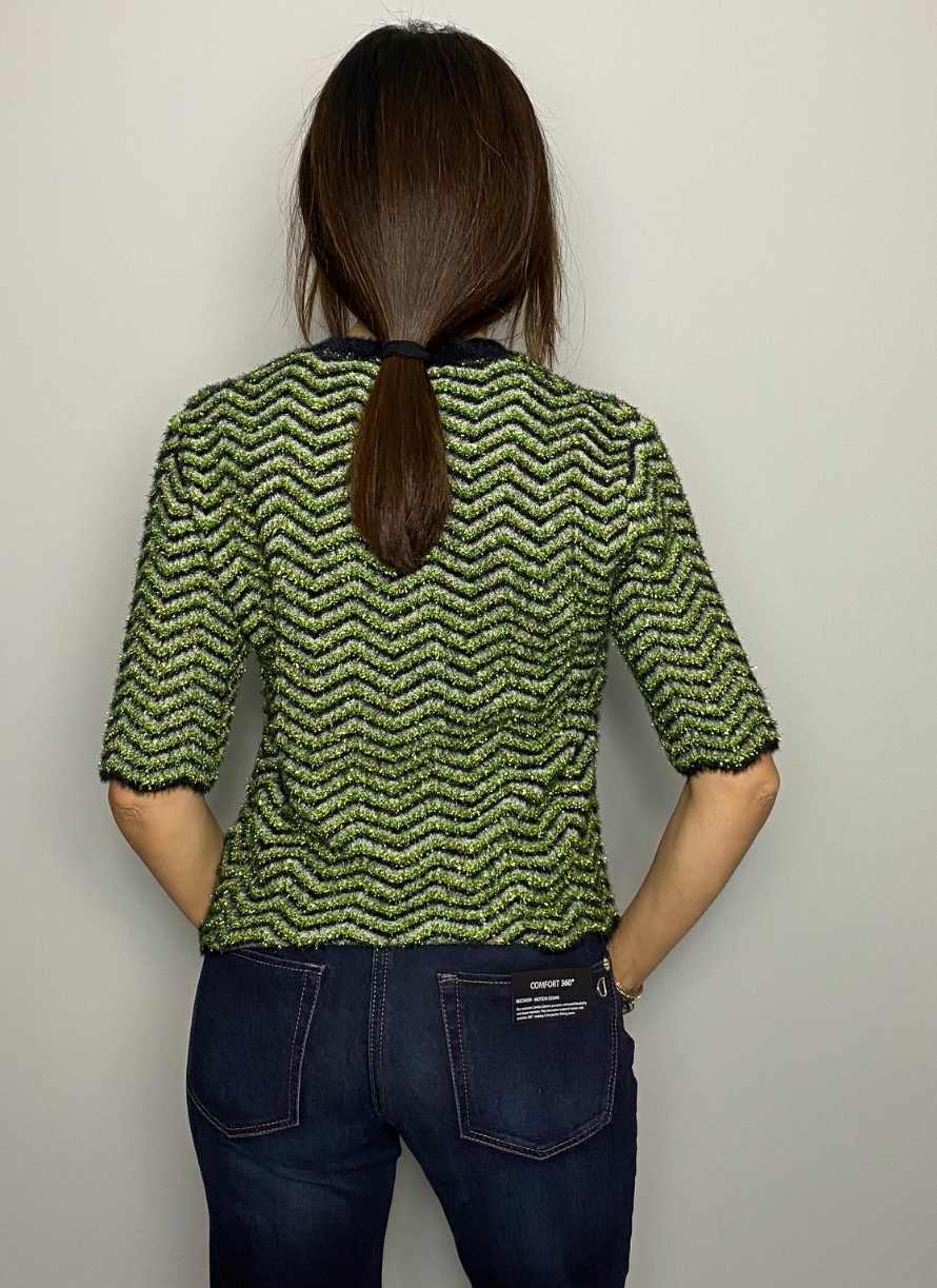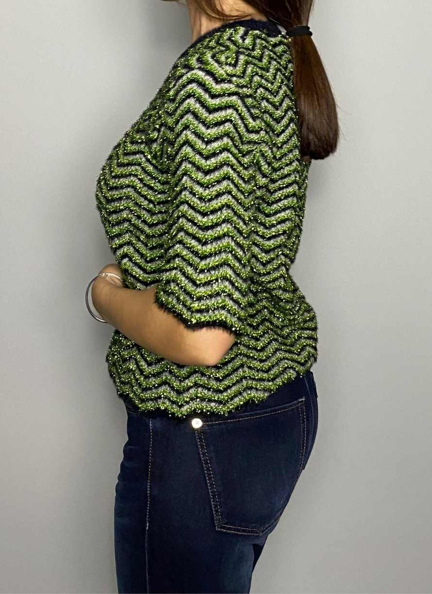 Este jersey de manga corta multicolor combina un tejido de punto con lurex que aporta un sutil brillo y un acabado sofisticado. Su corte entallado realza la silueta, ofreciendo un ajuste cómodo y estilizado. Perfecto para quienes buscan una prenda versátil que destaque por su textura y dinamismo en cualquier ocasión.