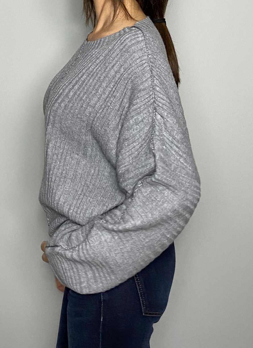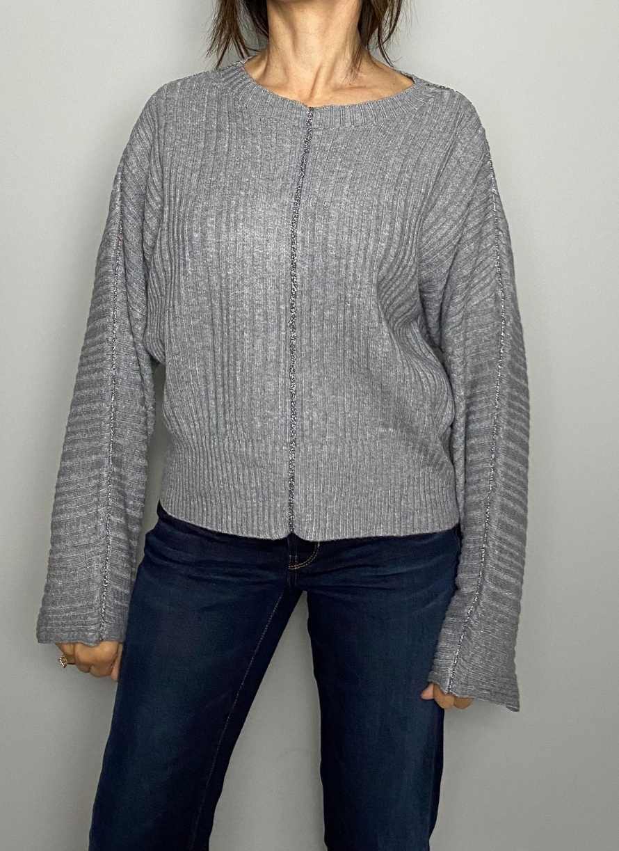 Este jersey oversize destaca por su cómodo corte amplio y mangas anchas, que aseguran libertad de movimiento y un estilo relajado. Su diseño incluye franjas con brillo de lurex que aportan un toque sofisticado y moderno, ideal para realzar cualquier conjunto. Perfecto para quienes buscan combinar confort y elegancia en una sola prenda.