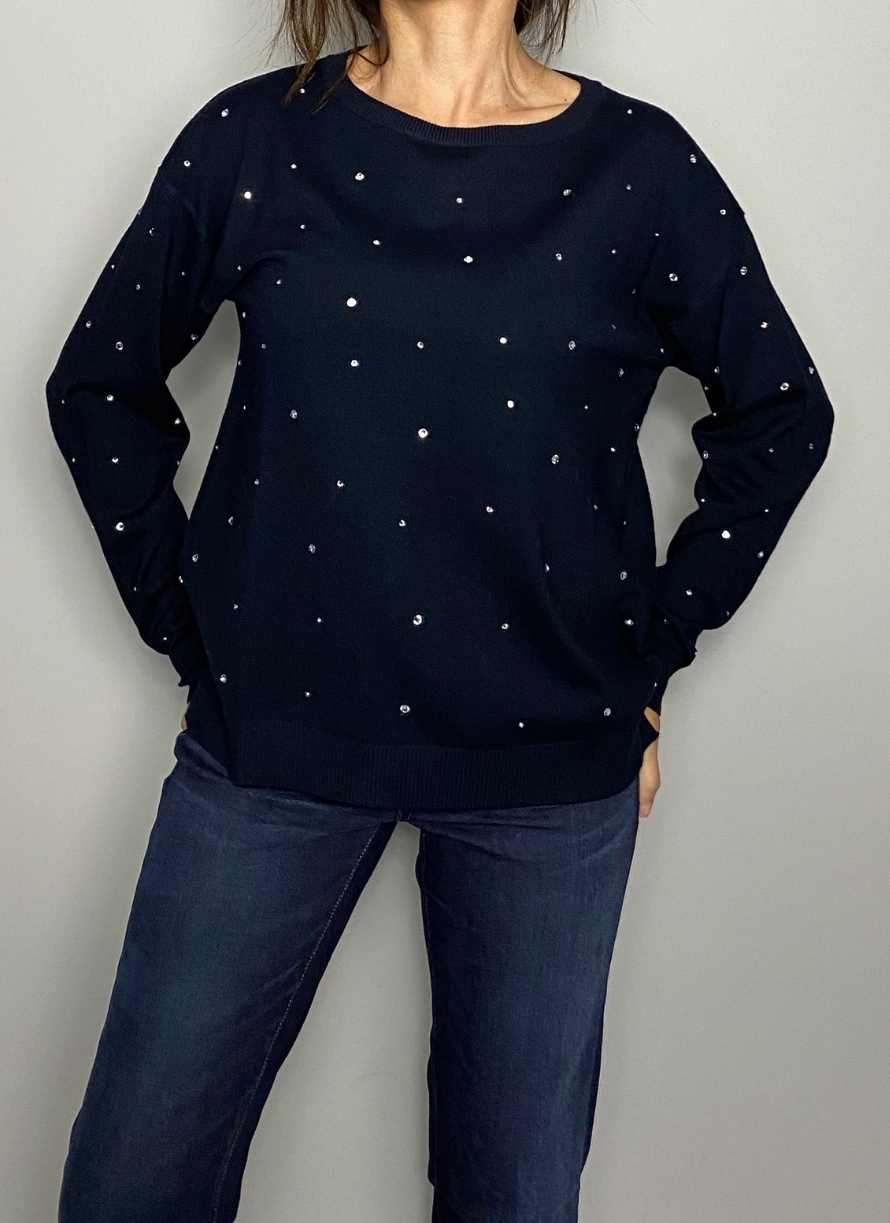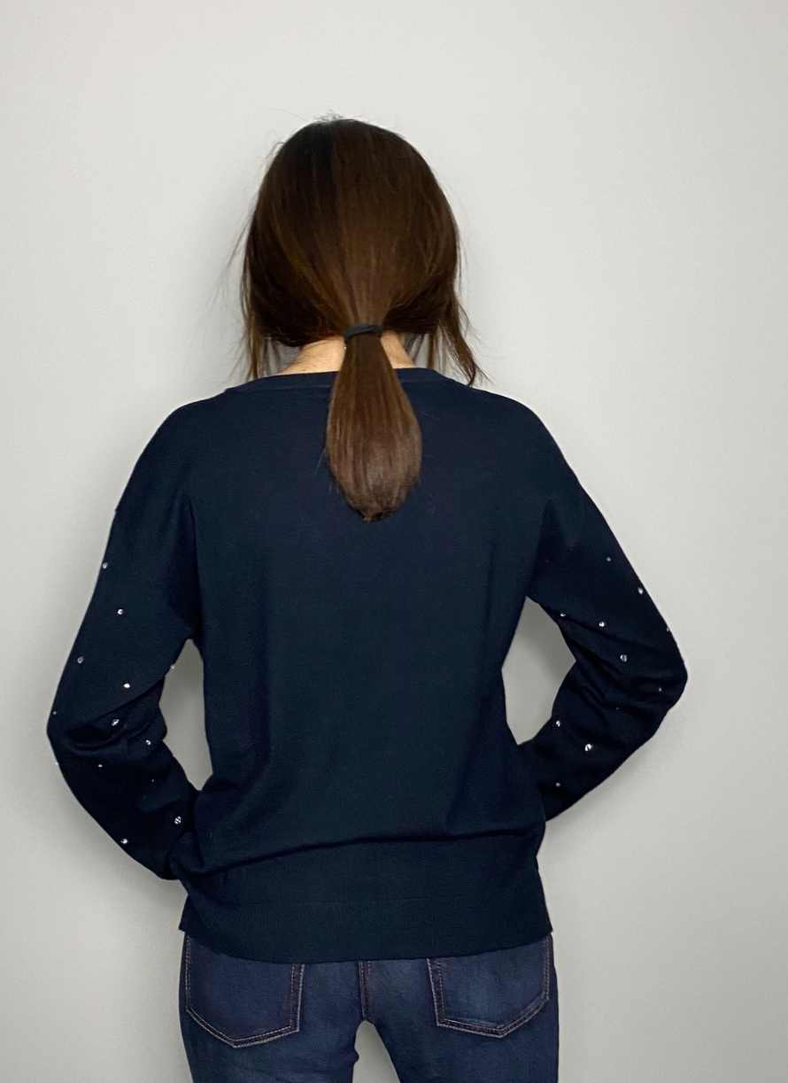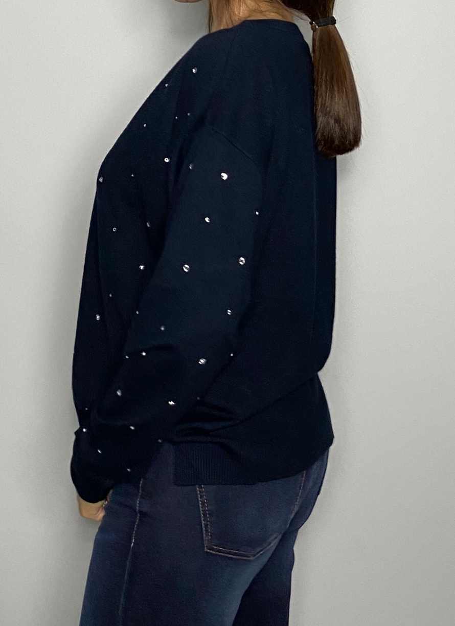 Este jersey de color marino presenta un cuello redondo y un corte entallado que realza la silueta. Las delicadas aplicaciones de pequeños cristales aportan un toque de elegancia y sofisticación, haciendo de esta prenda una opción ideal para ocasiones especiales o para añadir brillo sutil a tu look diario. Combina estilo y comodidad en una sola pieza.