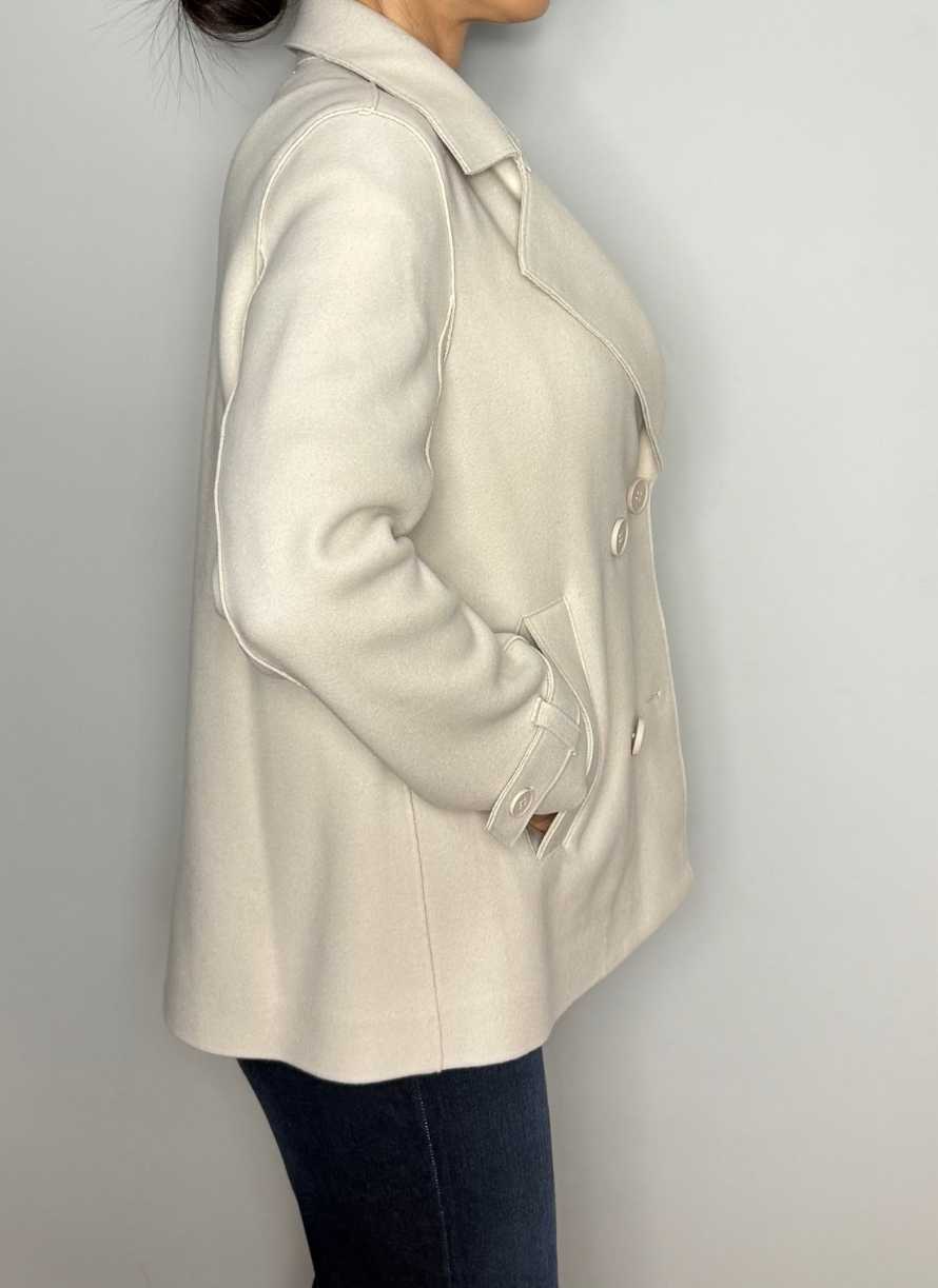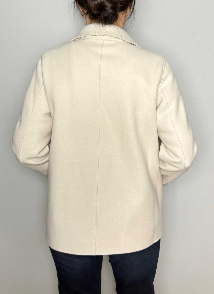 Abrigo corto confeccionado en lana, con cierre cruzado mediante botones que aportan un estilo clásico y elegante. Cuenta con cuello con solapas y diseño sin forro, perfecto para looks sofisticados en días frescos.