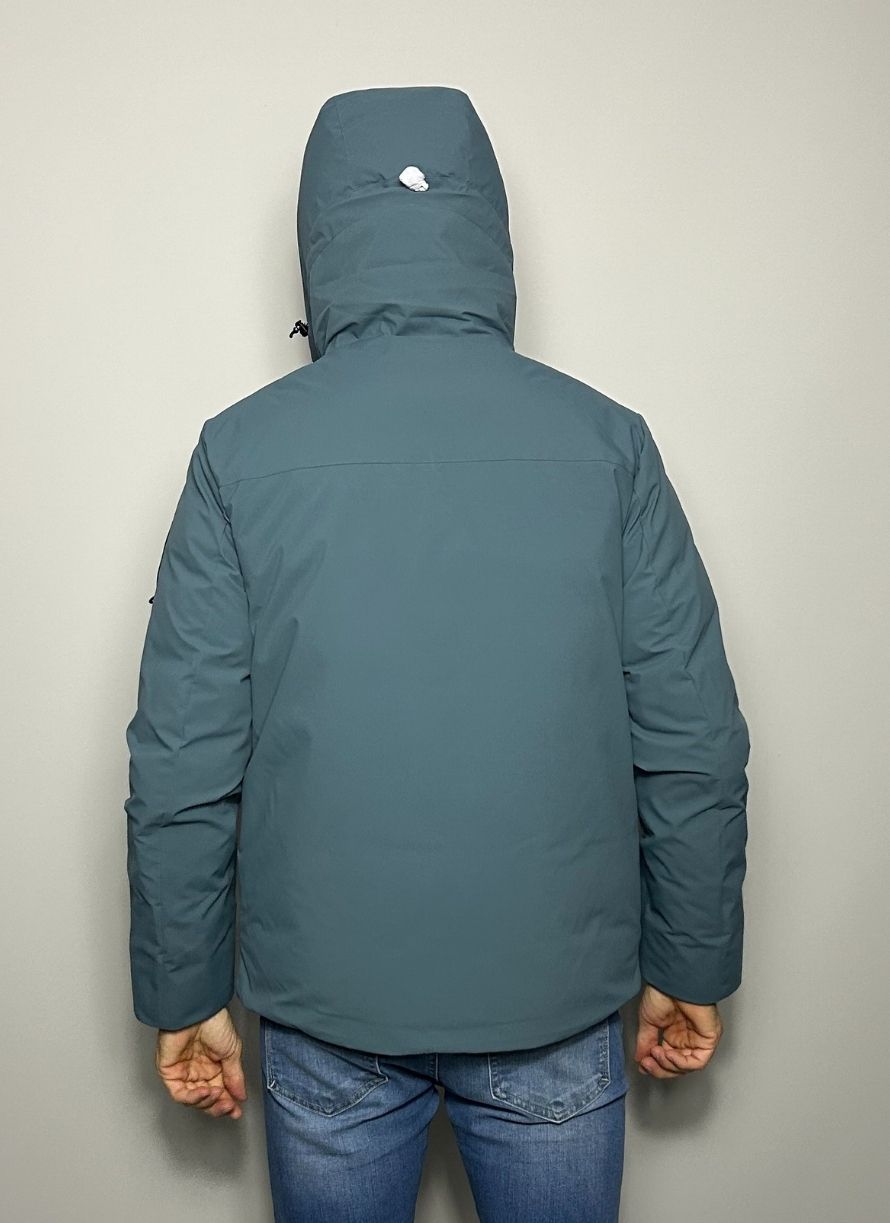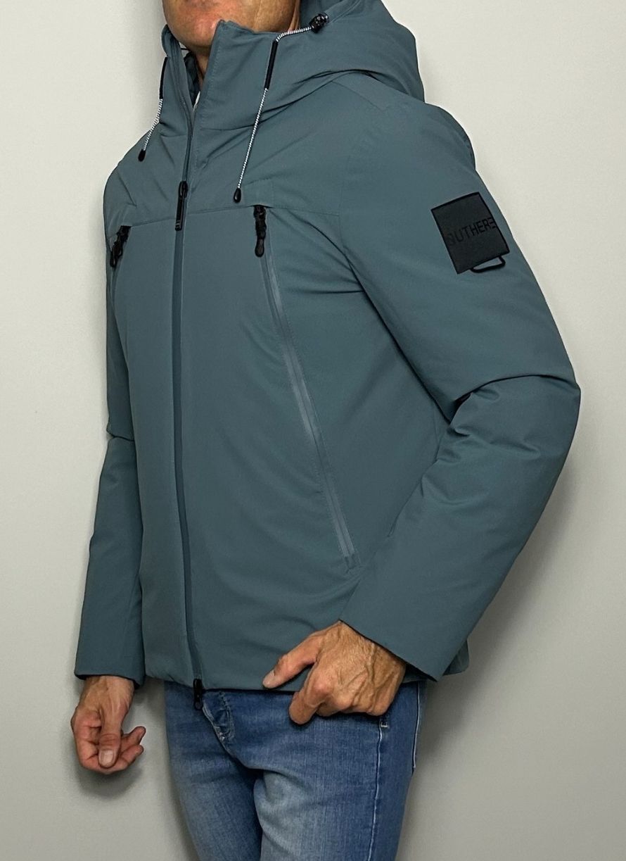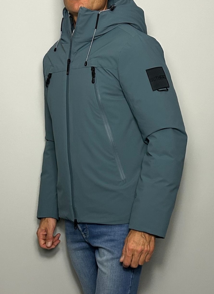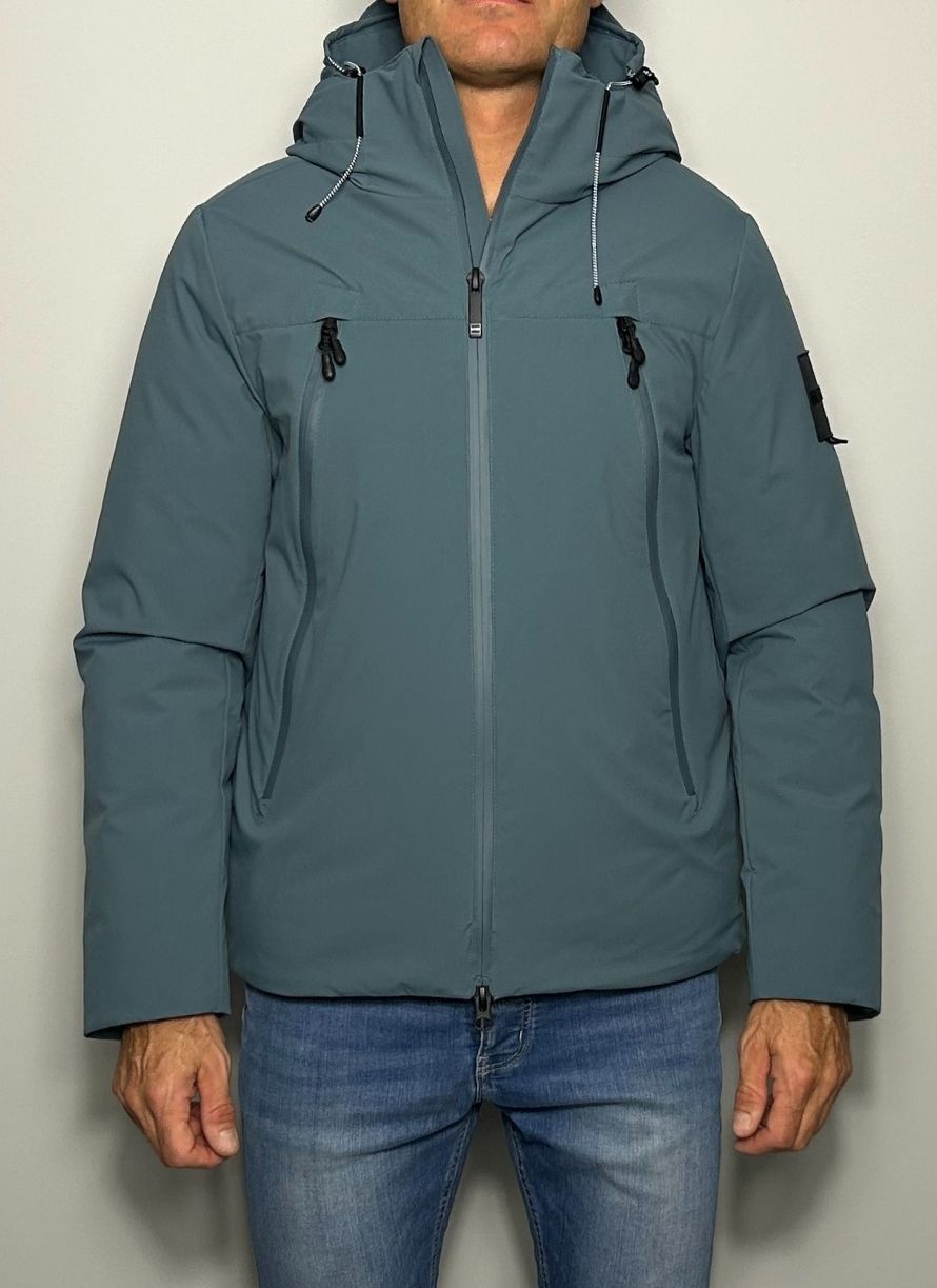 Plumífero corto, tela técnica, monocolor, cuello con capucha, interior en pluma de oca, cierre con cremallera, bolsillos con cremallera. Water repelent y tejido ultra ligth.