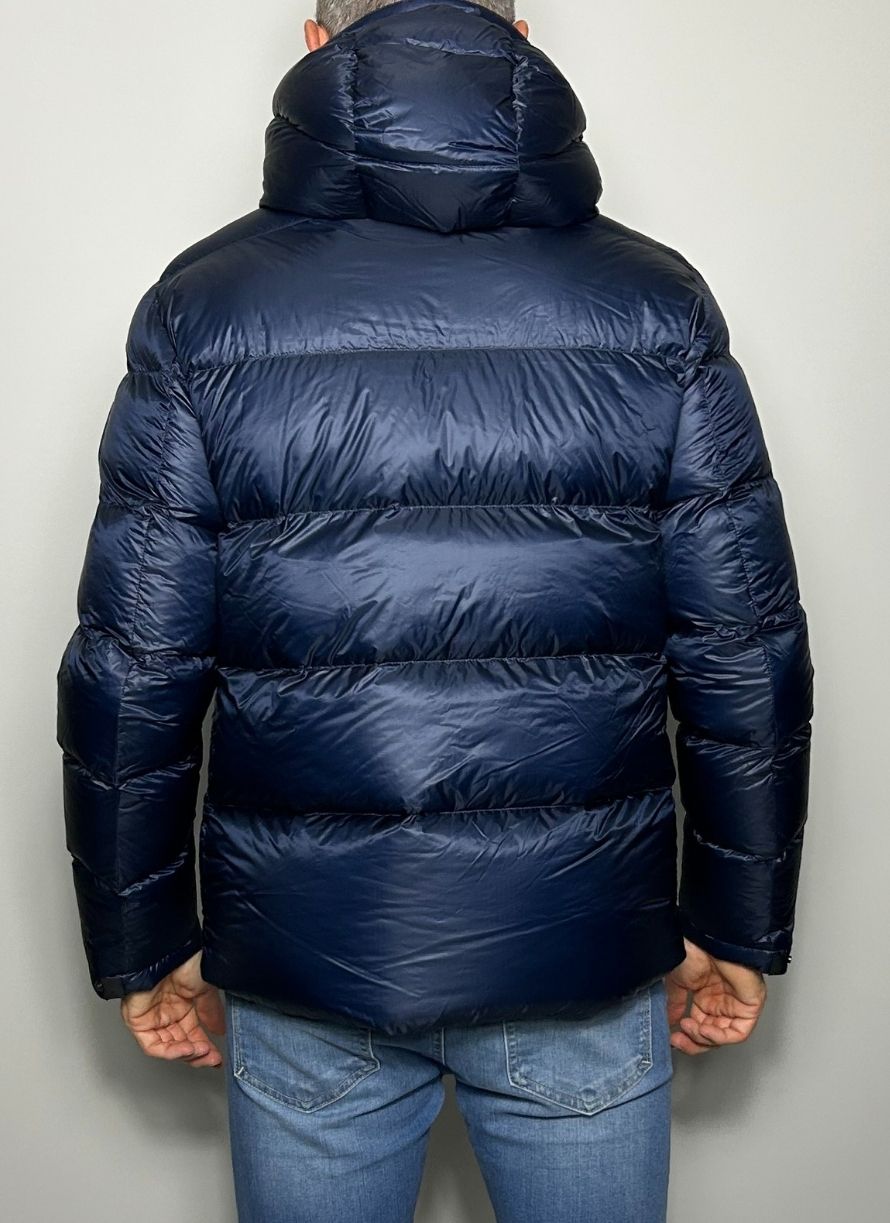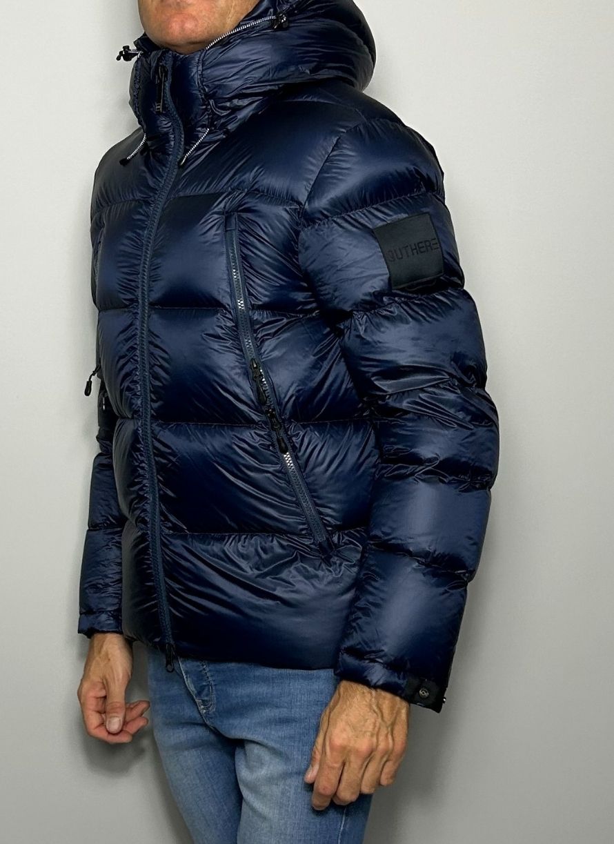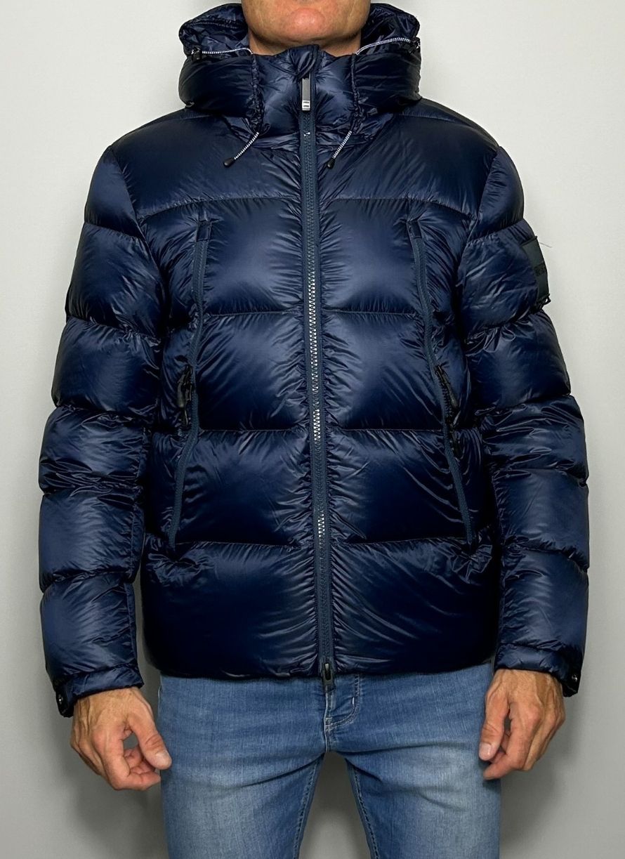 Plumífero corto, tela técnica, monocolor, cuello con capucha, interior en pluma de oca, cierre con cremallera, bolsillos con cremallera. Tejido ultra ligth.